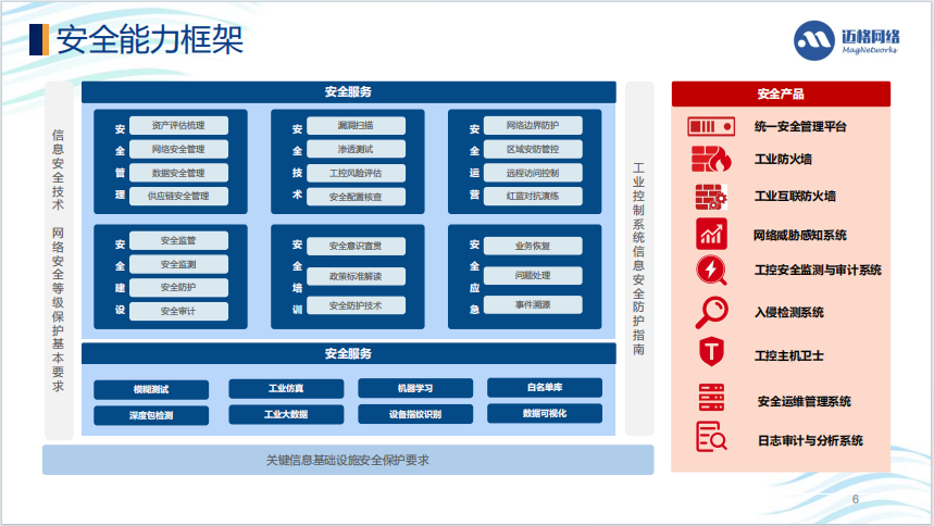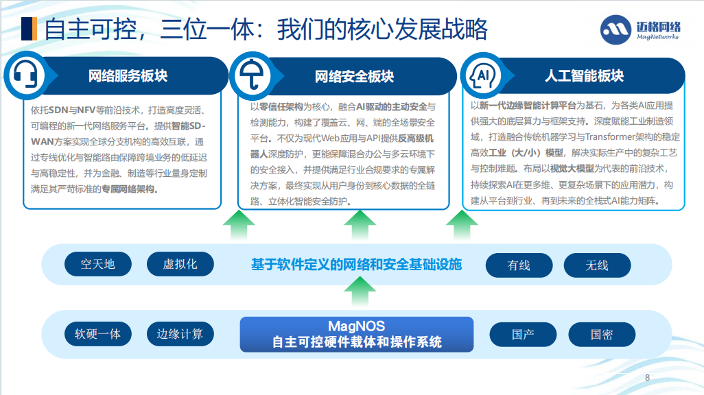 基础平台与硬件:MagNOS(网络操作系统)、MagEdge(边缘网关)、MagPEP(嵌入式设备设计)等,支持国产化与国密算法