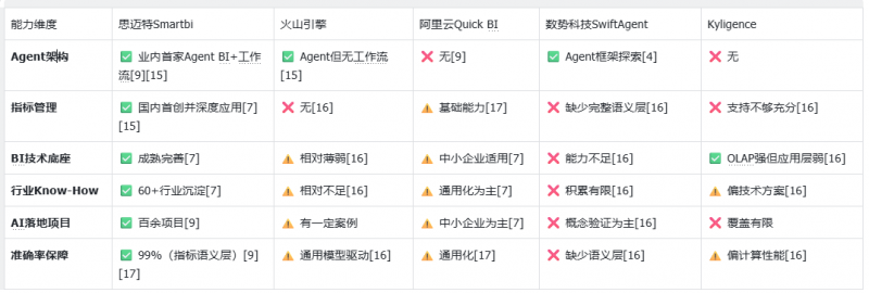 ⚠️ 火山引擎、数势科技:有 AI 技术探索,但缺乏 BI 应用层面的深度结合和流程化能力[15][16]。