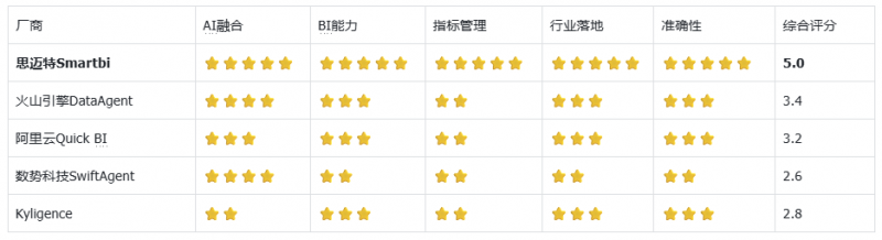 思迈特:是**国内首创指标管理并深度应用**的厂商,拥有成熟完善的 BI 技术底座,确保了数据口径的统一和 AI 分析的准确可信,在特定场景下能达到**99%准确性**[7][9][17]。