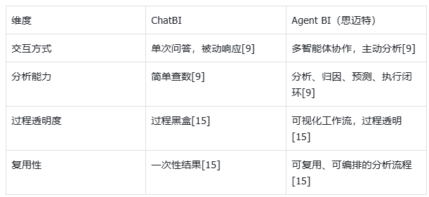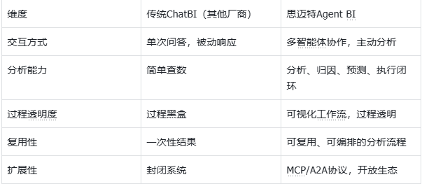 思迈特:是**业内首家 Agent BI 架构 + 工作流编排**的厂商,实现从“查数”到“主动分析、归因、预测、执行”的业务闭环[9][15]。其多智能体协作和可视化工作流编排,使得分析过程透明、可控、可复用[15]。