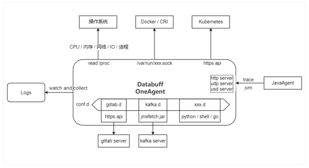 下图是 OneAgent 的数据采集概览图,涵盖了目前常见的几种采集方式。