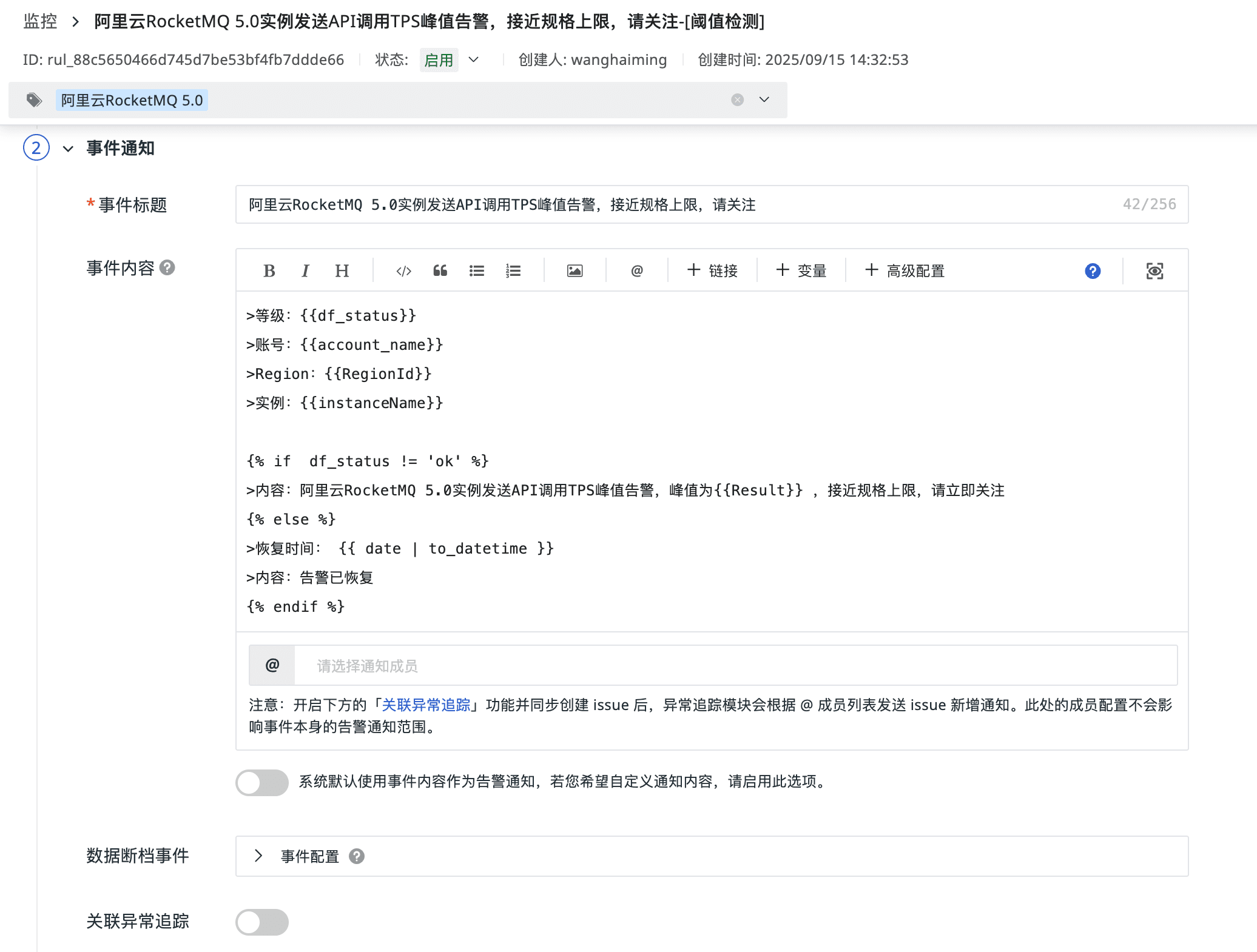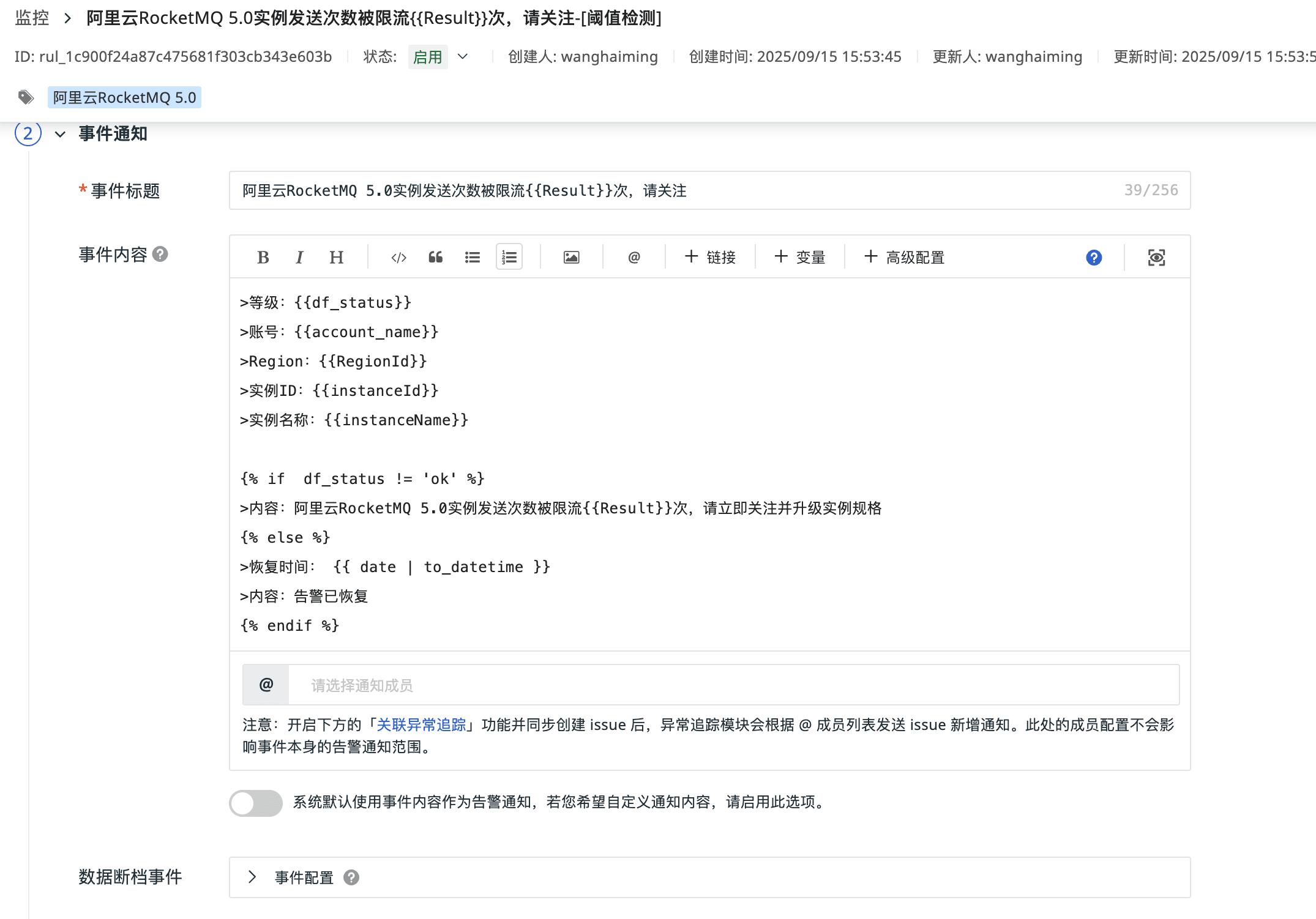 简要描述:云消息队列 RocketMQ 版支持将指定实例触发限流的事件作为监控项,通过对限流次数的监控,可以帮助您了解当前业务的受损情况。业务侧上线后根据可容忍的经验评估报警阈值。