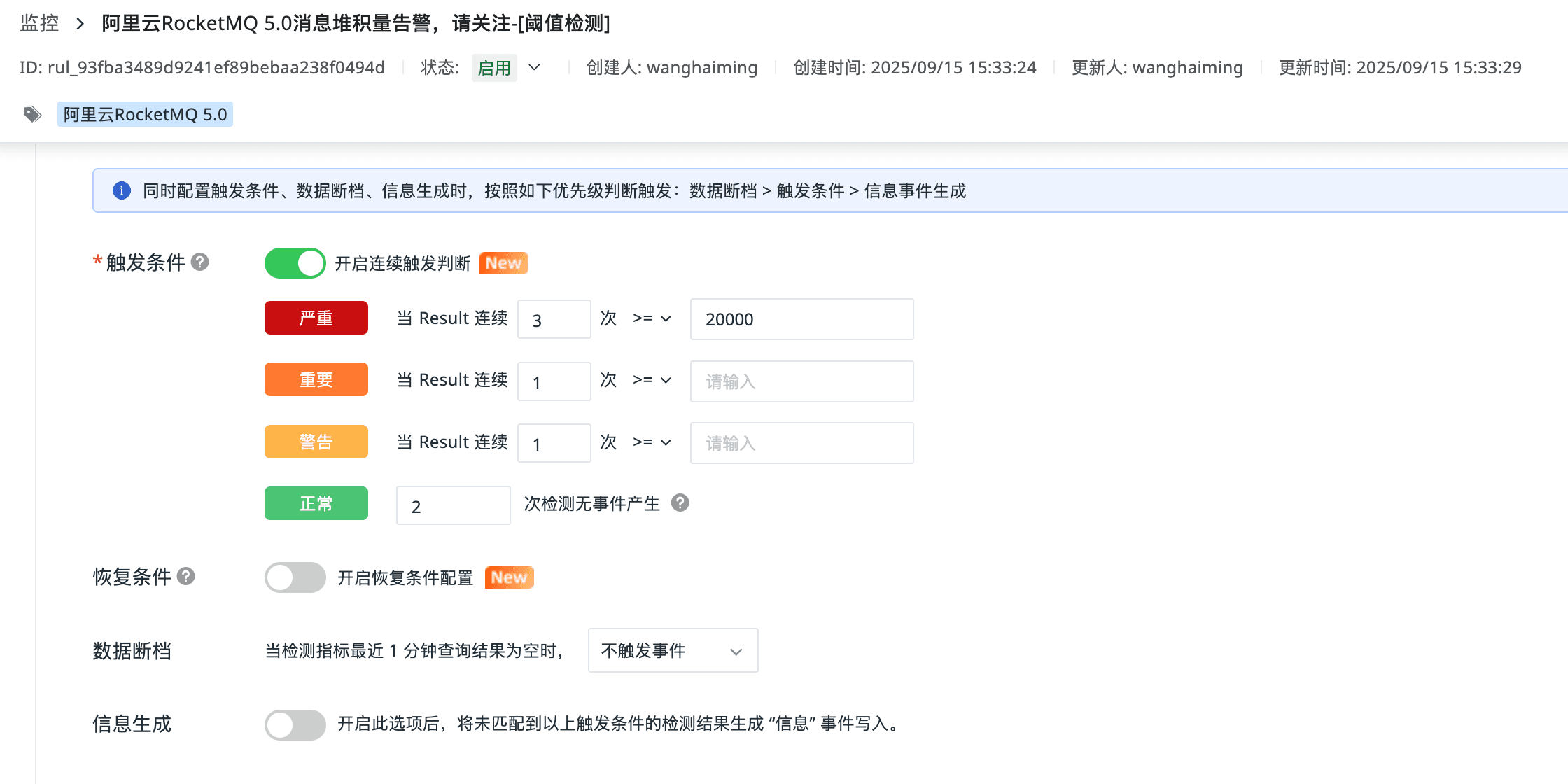 简要描述:云消息队列 RocketMQ 版支持按照 ConsumerGroup 粒度监控消息堆积量,可以用来预警下游消费堆积故障场景。业务侧上线后根据可容忍的经验评估报警阈值。