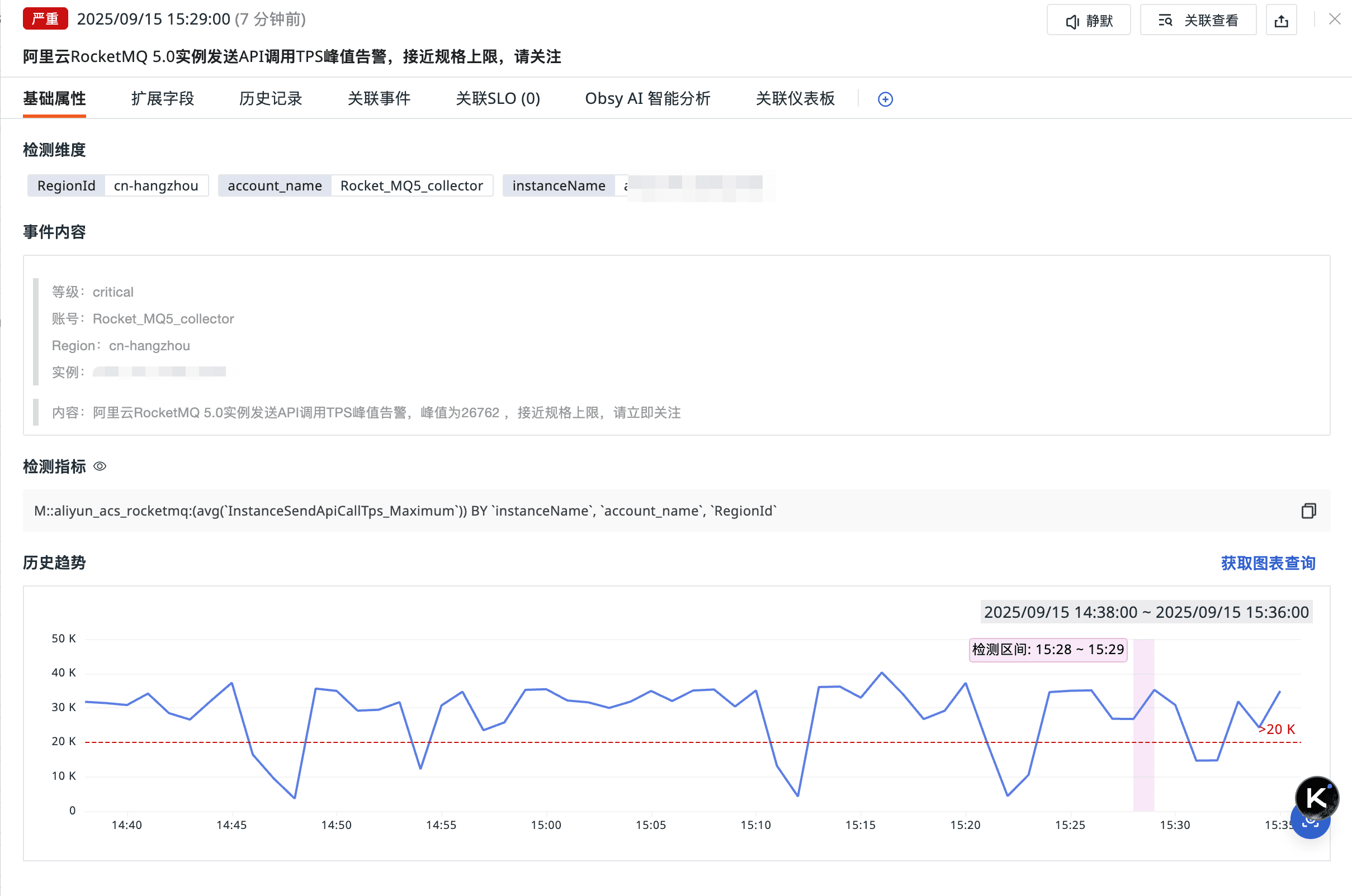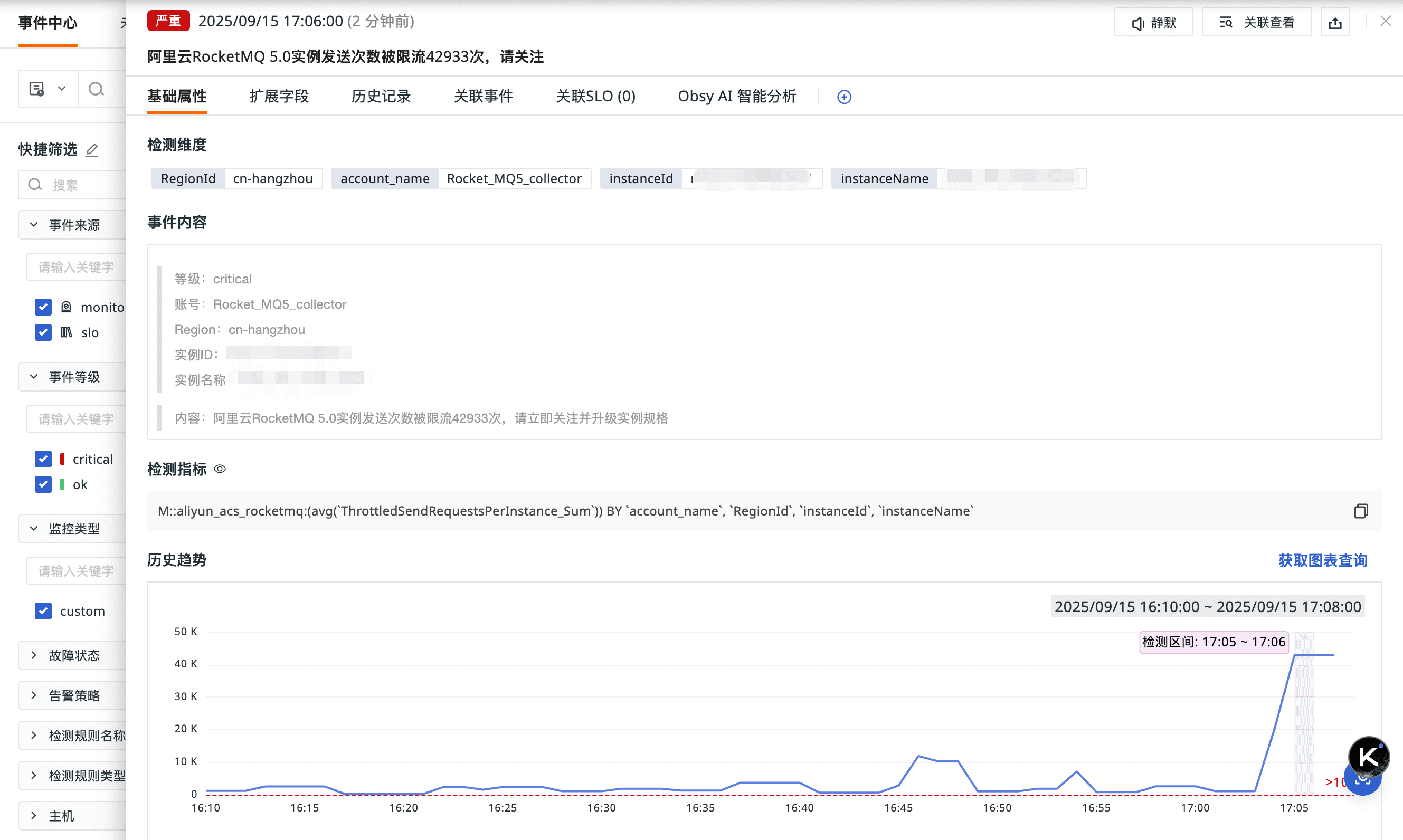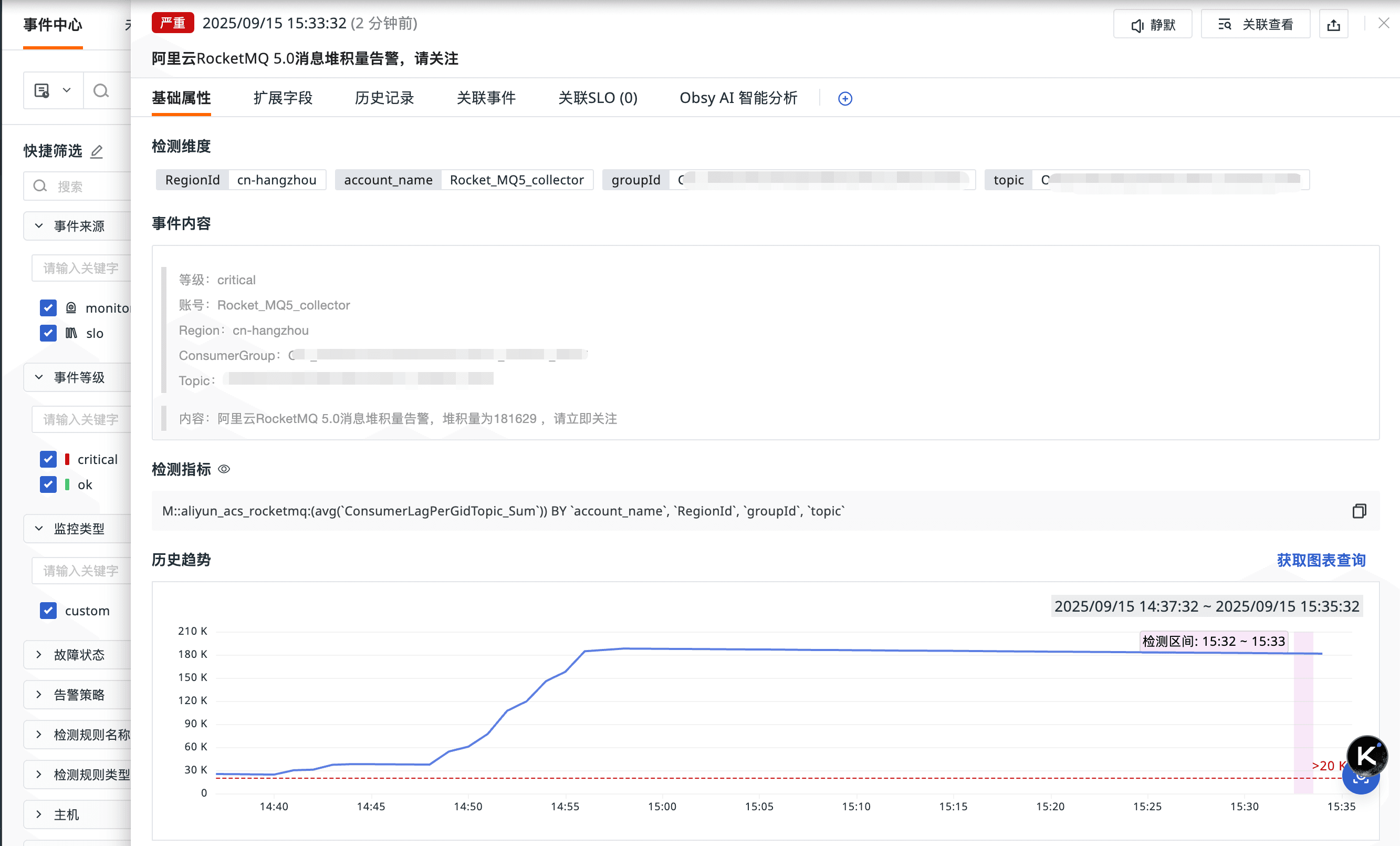 通过将阿里云 RocketMQ 5.0 的原生监控数据集成到观测云平台,用户可以实现更全面、更高效的数据监控与分析。观测云作为一个强大的可观测性平台,能够将阿里云 RocketMQ 5.0 监控数据与自身丰富的数据处理和可视化能力相结合。用户不仅可以实时查看 RocketMQ 5.0 的运行状态,如消息堆积、发送调用 API 峰值超过阈值、限流等关键指标,还可以通过观测云的智能告警功能,快速发现并响应潜在的性能问题或异常情况。此外,观测云支持多种数据源的整合,能够将 RocketMQ 5.0 数据与其他云服务或本地应用的监控数据进行关联分析,帮助用户从全局视角洞察系统的健康状况,从而更好地优化资源配置、提升系统稳定性,并为后续的运维决策提供有力支持。