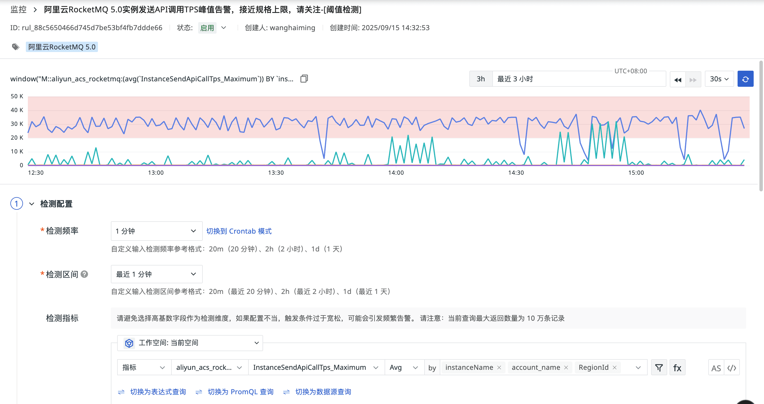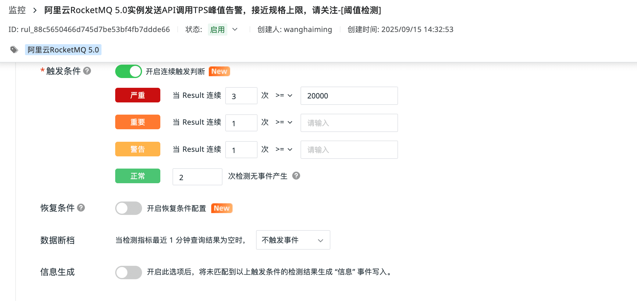 简要描述:RocketMQ 版 5.0 实例规格明确规定了消息收发基础规格 TPS 上限,即消息收发 API 调用频率。若实例消息收发 API 调用 TPS 峰值超过规格限制,会导致实例被限流。阿里云建议设置为实例发送 TPS 峰值上限的 70%。例如消息发送 TPS 峰值上限为 5000,则阈值设置为 3500。