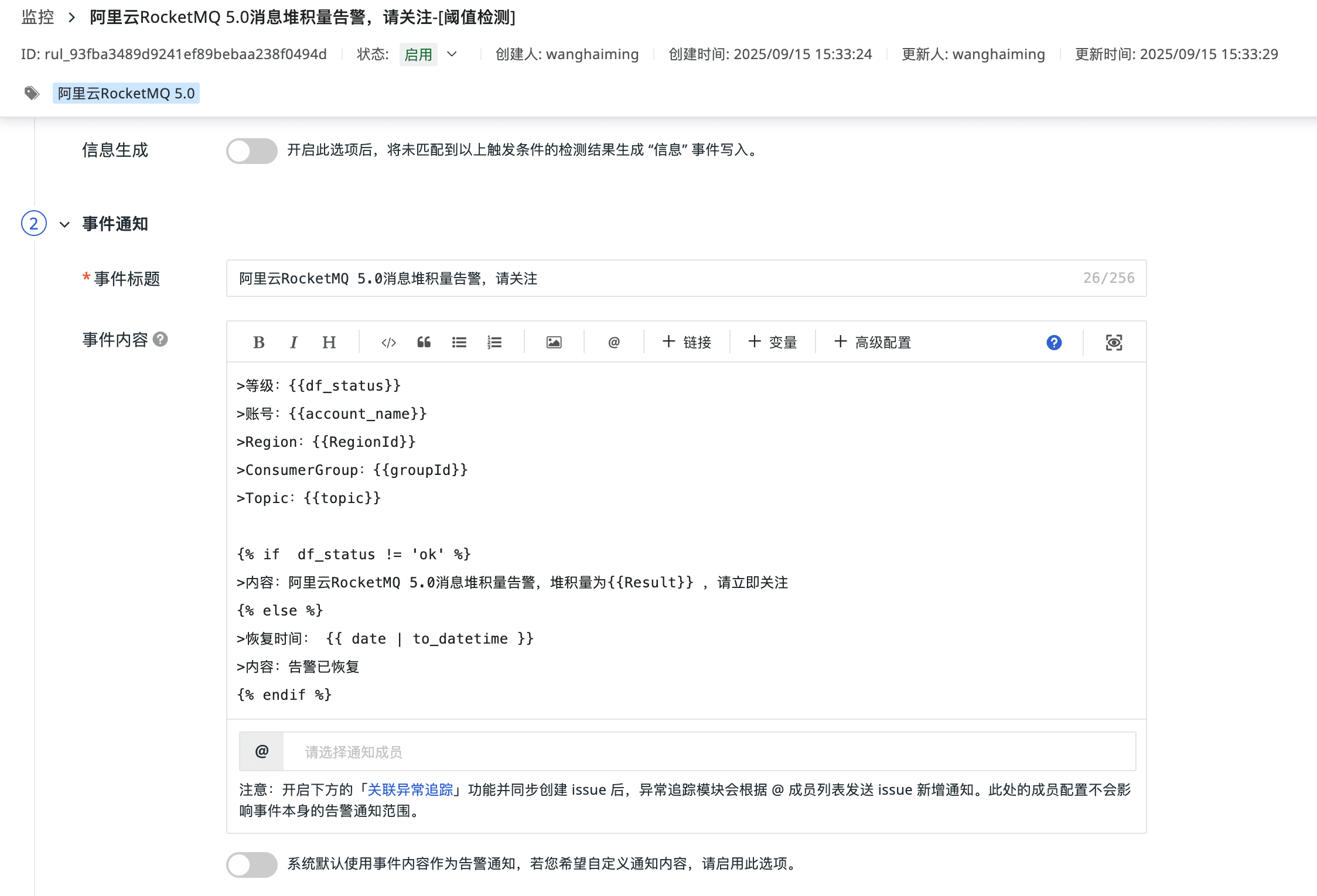 登录 观测云控制台,点击「监控」 -「新建监控器」,选择官方模版库,输入 “RocketMQ 5.0”, 选择对应的监控器,点击 “确定” 即可添加。