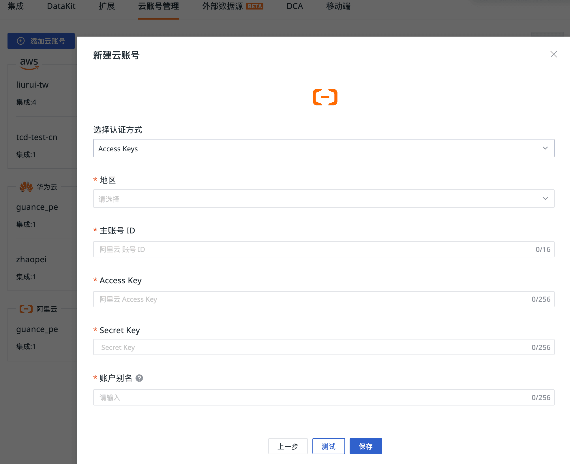 点击【添加云账号】,选择【阿里云】,填写界面所需的信息,如之前已配置过云账号信息,则忽略此步骤