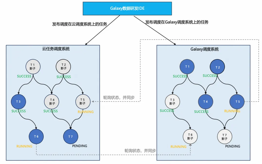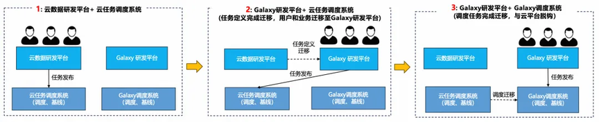 因此架构上一套研发平台需要同时适配两套调度系统(云任务调度+Galaxy 自研调度系统 ),并支持逐步往自研 Galaxy 调度的平滑演进。