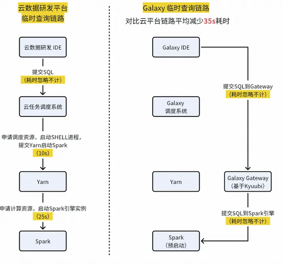 通过简化调用链路+Spark Driver 预启动等查询加速技术,平均每个 Query 可以比原云数据研发平台固定节约 35s+。