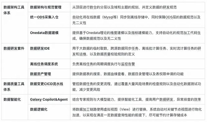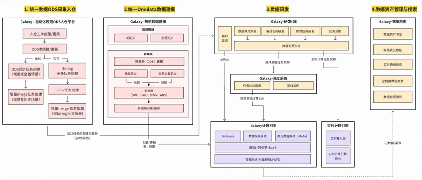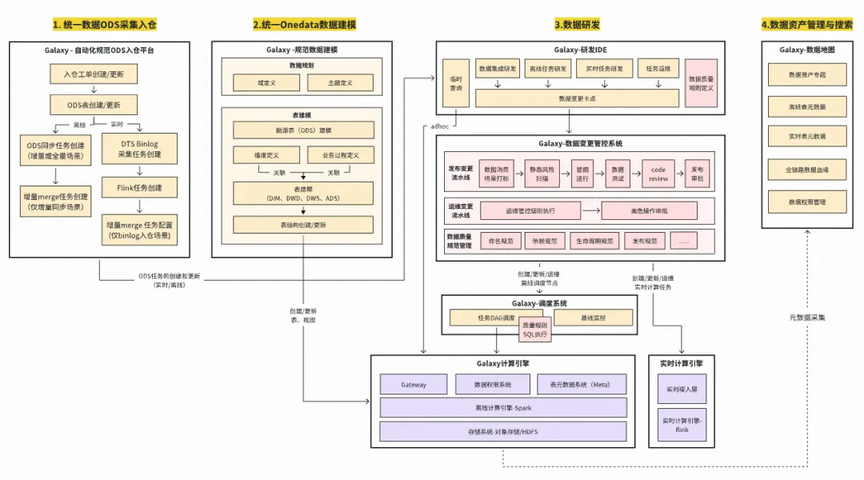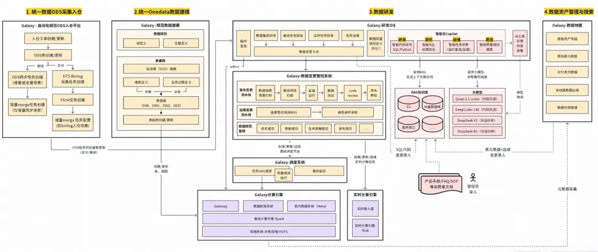因此 24 年技术部正式启动大数据系统自建,Galaxy 数据研发与管理平台为其中一个重要项目,负责面向参与数据生产的用户,提供离线和实时数据的采集同步、研发运维、加工生产、数据资产管理以及安全合规的能力,满足业务长期发展对于数据架构、数据质量、数据交付效率的诉求。