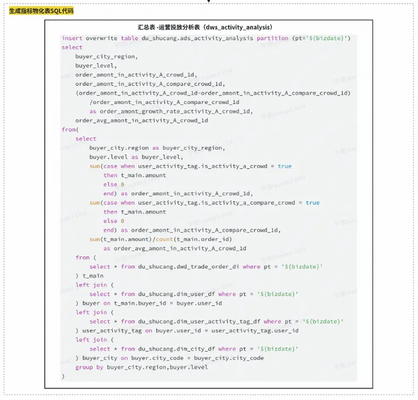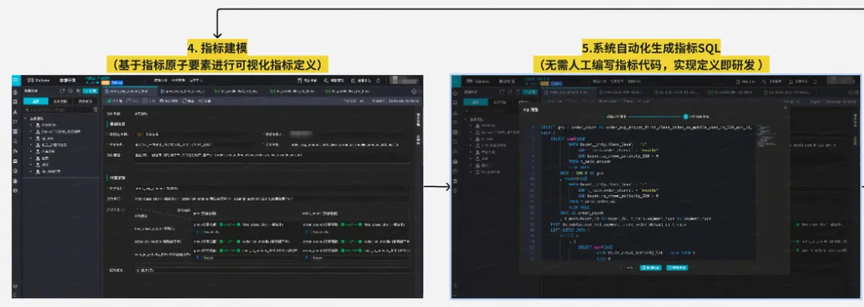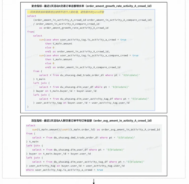 从上图我们也可以看到,原子口径的变更影响非常大,即使可以基于血缘进行变更握手管控,人工修改逻辑也容易改错或遗留。因此我们实现了自动化指标代码生成的能力,基于原子口径自动化生成指标及其物化表的加工逻辑。