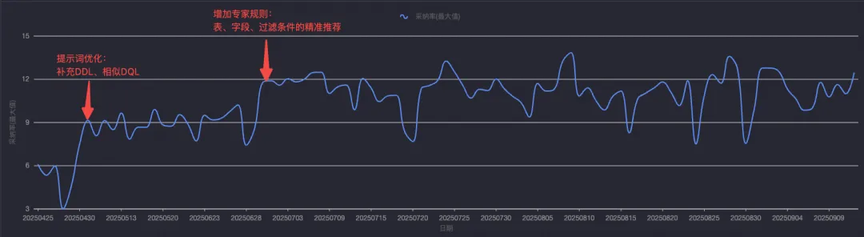 其中高活用户的智能代码续写功能开启率为 98.5%,整体采纳率趋势和我们做的优化动作如下: