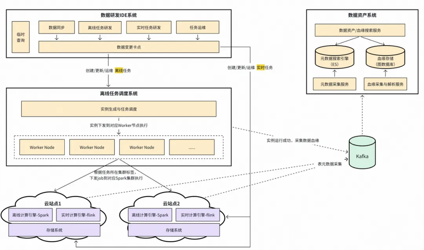数据研发套件包含数据研发 IDE、数据资产系统、离线任务调度系统三部分,在平台中的定位类似于“汽车的驾驶舱”,为数据工程师提供丰富的工具集,控制全公司的数据流动与计算。整体系统架构如下图所示: