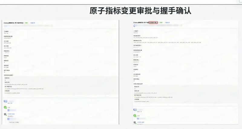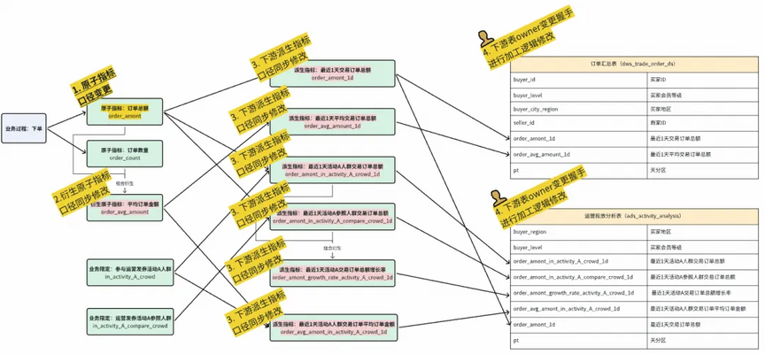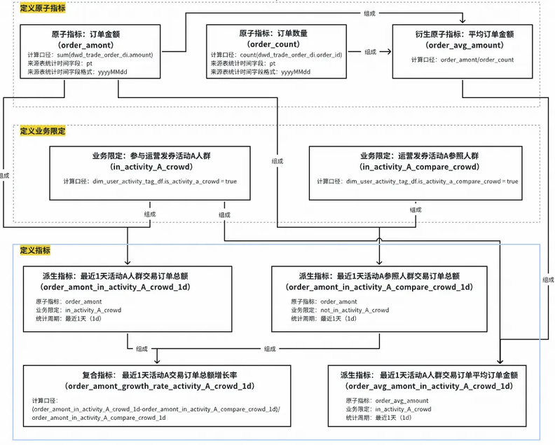 其中最为关键部分为“指标建模”。我们将指标的口径组成拆成了三部分组成:原子指标、业务限定、统计周期,同时在其物化到表上的时候再确定统计粒度。通过原子要素的组合定义指标可以确保同样的指标在公司全局只会有一个,以及标识出不同的汇总表、应用表中的指标是否为同一个。另外当原子口径发生了变化,系统也可以根据血缘关系找到受影响的指标和表,让 owner 进行握手确认,确保口径变更一致性。例如下图所示: