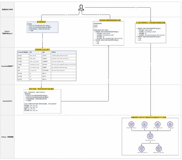 Galaxy 的 ETL Agent 会采用“NL2Metric2SQL”的方案。通过大模型进行自然语言的解析,结合向量数据库的相似度匹配实现 NL2Metric 的能力,然后基于 Onedata 数据模型和指标语义层,将自然语言的用数需求准确翻译为指标原子要素(原子口径、业务限定、统计周期、统计维度),并自动构建 ETL 加工链路。如下图案例: