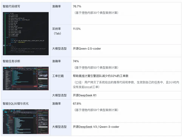 目前 Galaxy 研发平台已经落地了智能代码续写、智能任务诊断、智能 SQL 纠错与优化 3 个 Copilot 应用,具体业务效果如下: