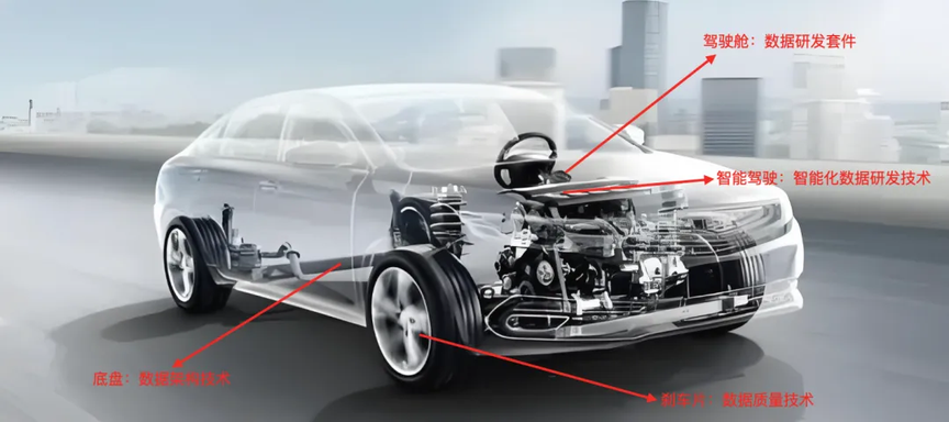 24 年立项开始至今,我们主要专注在 4 个最核心能力的建设,分别为:数据研发套件、数据架构技术、数据质量技术、智能化数据研发。如果把数据研发平台比喻成一辆汽车,那么这四部分的定位如下图所示: