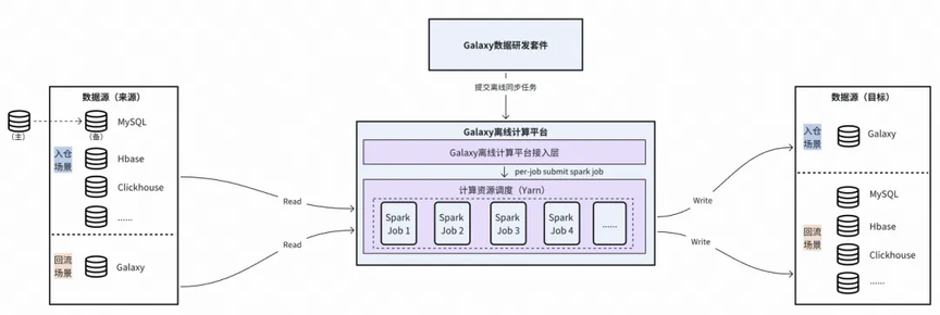 目前 Galaxy 数据研发套件的离线同步内核基于 Spark Jar 进行实现,下图为离线数据同步架构: