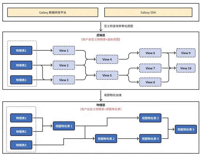 数据逻辑化架构,会存在两层,上层为由用户定义的物理表以及虚拟视图组成的逻辑层,对用户感知;下层为物理表和系统自动生成的视图物化表组成的物理层,对用户不感知,具体如下图所示: