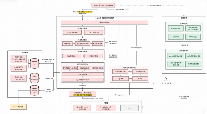 当前我们处于 L1 的 Copilot 阶段,通过在数据研发流程中,旁路嵌入基于专家经验规则和大模型的智能 SQL 代码续写、智能任务诊断、智能 SQL 代码纠错与优化、 智能质量规则推荐等应用,辅助用户进行高效数据研发。嵌入 Copilot 后的 Galaxy 研发平台整体架构如下,主要关注红色部分:
