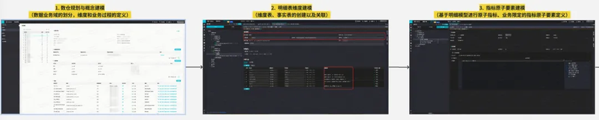 目前已完成数仓规划->概念建模->明细表维度建模->指标建模->指标代码自动化生成->汇总表代码自动化生成的 Onedata 规范建模研发全流程,产品效果如下: