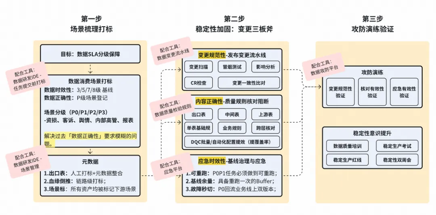 然而过往数仓的数据交付只是停留在快速提供数据以发挥业务价值这一步,业务和研发对数据质量和稳定性保障重视度严重不够,并且没有明确生产变更和数据质量校验的 SOP,同时也没有健全的工具体系支撑,全靠数据工程师的自我修养,导致历史上很多核心数据加工任务没有保障或者保障不全面,不断引发 P 级故障。
