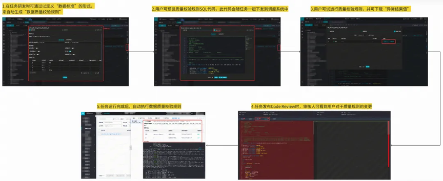 Galaxy 数据研发平台已经实现了完善的数据质量规则校验能力,用户在 Galaxy 数据研发 IDE 上面向数据标准进行高效的质量规则定义,系统会自动生成校验 SQL 随着任务的发布一起下发到调度系统中执行。同时支持了强规则(主路执行,数据异常阻断任务执行)和弱规则(旁路执行,数据异常进行告警)两种规则运行场景,应对不同的场景诉求。产品效果如下所示: