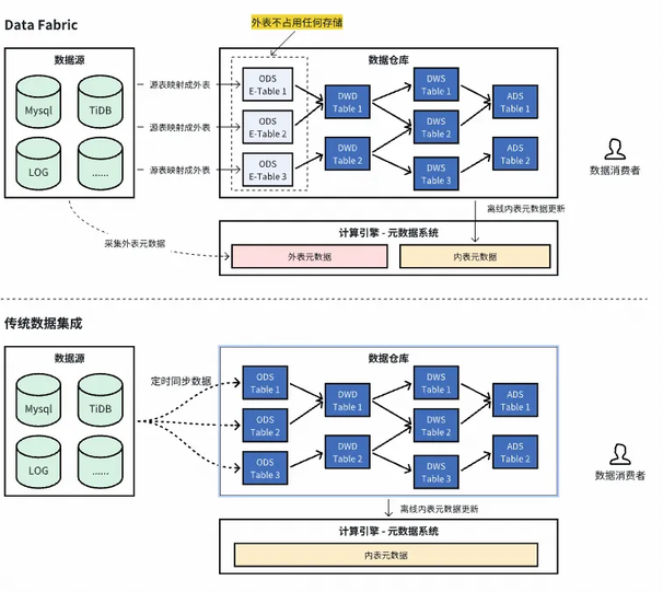 Data Fabric(数据编织)是一种全新的数据集成架构方案,核心理念是 “不移动数据,移动计算”。 技术实现方案上以外表的形式来封装源端表,通过统一的元数据系统,将源端表(外表)和离线表(内表)统一管理起来,使用起来对用户无感。在执行计算时,通过 Spark 引擎的跨源联邦查询能力,直接从各源端数据库(一般为备库或抽数库)将数据查询回来后进行分布式计算。下图展示了 Data Fabric 与传统数据集成的区别: