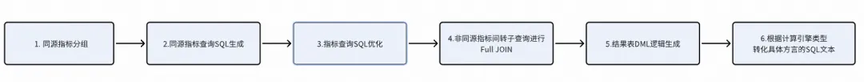 将指标按来源表分组,并将其的组成原子要素(原子指标+业务限定+统计周期+统计粒度)进行 SQL 逻辑的组装、优化、方言翻译,具体流程为: