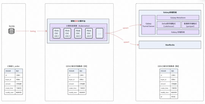 通过实时计算引擎 Flink CDC 将变更数据实时更新到存储系统中,保持数仓 ODS 表和来源数据库表的增全量同步,整体架构更加简单,并减少 ODS 层的批计算和冗余存储成本。目前规划通过 Paimon、Iceberg 等开放 Lakehouse 能力来实现离线存储系统的实时事务性更新。根据实际业务场景,也可以直接将数据实时写入 StarRocks 等支持更新的 OLAP 数据库中。