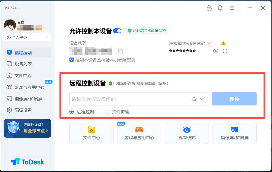 ToDesk: 支持 1080P 360 帧的高帧率传输。