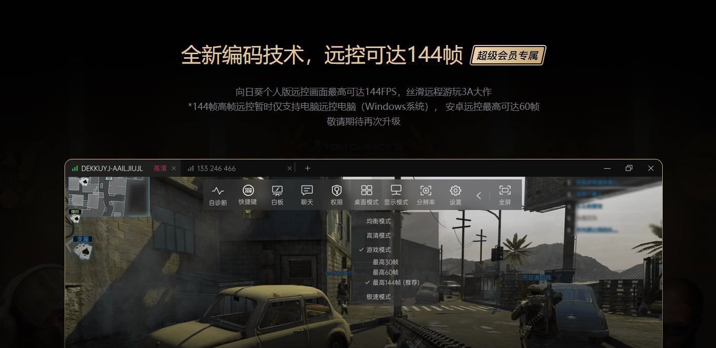 另外,向日葵画质最高支持 4K 144 帧,144 帧高帧远控仅支持电脑远控电脑(Windows 系统),还需要升级为超级会员,价格昂贵且显示效果一般。