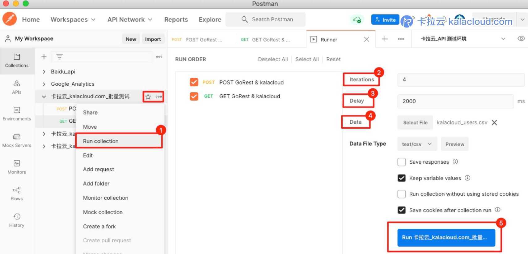 打开「卡拉云 kalacloud.com 批量测试」合集的「Run Collection」的设置页