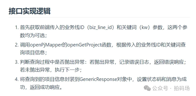 接口实现逻辑:按实际执行顺序,清晰描述接口从请求接收、参数校验、业务处理到结果返回的完整业务流程,帮助开发者理解底层逻辑;
