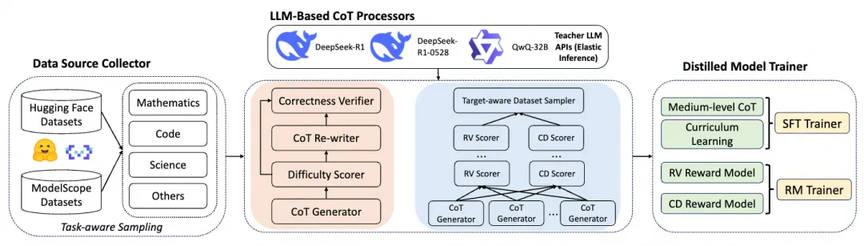 (3)蒸馏奖励模型:支持基于上述模型蒸馏知识的强化学习,进一步提升推理能力。为了构建上述模型,本工作构建了完整的数据处理和模型训练工作流,如下所示。