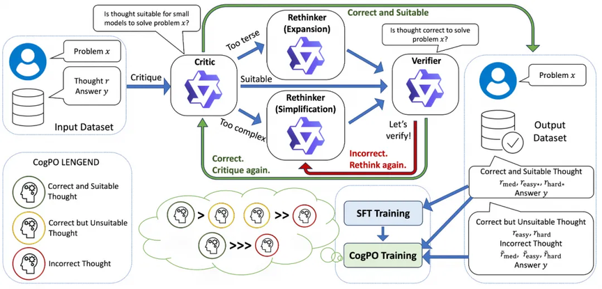 大型推理模型(Large Reasoning Model,LRM)如 OpenAI 的 o1 和 DeepSeek-R1 通过深度思考大幅提升了复杂任务的推理能力,但其庞大的参数规模和计算资源消耗限制了实际应用。相比之下,小型推理模型虽更轻量,但因认知路径和推理能力与大模型存在显著差异,直接蒸馏大模型的链式思考(Chain-of-Thought, CoT)过程往往效果有限,且依赖大量标注数据。针对这一挑战,本工作提出了“评判-再思考-验证”(Critique-Rethink-Verify, CRV)算法,旨在训练参数量小却能力强大的推理模型。CRV 系统通过多个大语言模型智能体协同工作:首先根据小模型的认知能力对 CoT 推理过程进行评判,随后基于评判反馈对推理进行再思考和精炼,最终验证优化结果的正确性和有效性。基于 CRV,进一步提出了认知偏好优化(Cognitive Preference Optimization, CogPO)算法,动态调整训练策略,使小模型的推理过程与其自身认知能力相适配,从而显著提升推理性能。