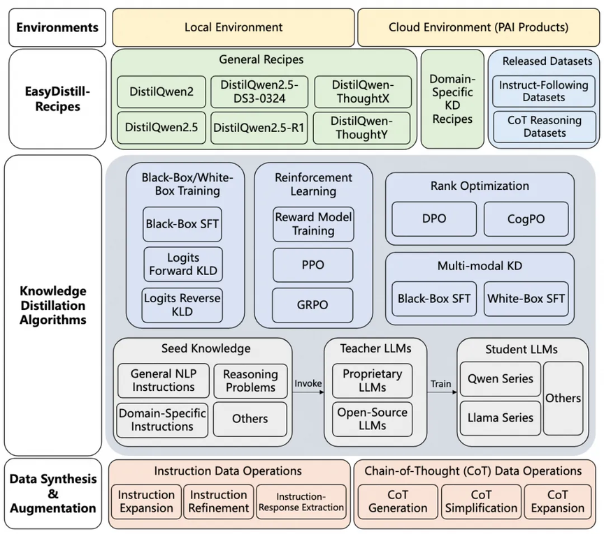 EasyDistill 集成了数据合成、监督微调、排序优化以及强化学习方法,覆盖黑盒与白盒两种常见蒸馏范式,并支持面向非推理型与推理型模型的蒸馏策略。此外,EasyDistill 不仅提供工具层面的支持,还开源了一系列性能优异的蒸馏模型(如 DistilQwen)和相关数据集,满足多种实际应用需求。同时,EasyDistill 已成功集成于阿里云人工智能平台 PAI,充分展示了其工业落地能力。通过 EasyDistill,大模型 LLM 知识蒸馏技术得以更广泛普及,为 NLP 社区和产业界带来价值。
