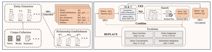 论文提出并实现了一种创新的“查询自动演化框架”(AutoEvolve),旨在解决自动化构建检索增强生成(RAG)系统评测基准中适用性弱与扩展性弱的核心难题。该框架以语料库无关的方式动态生成并迭代提升问题难度,为构建更具挑战性与可扩展性的 RAG 评测体系提供了新思路。