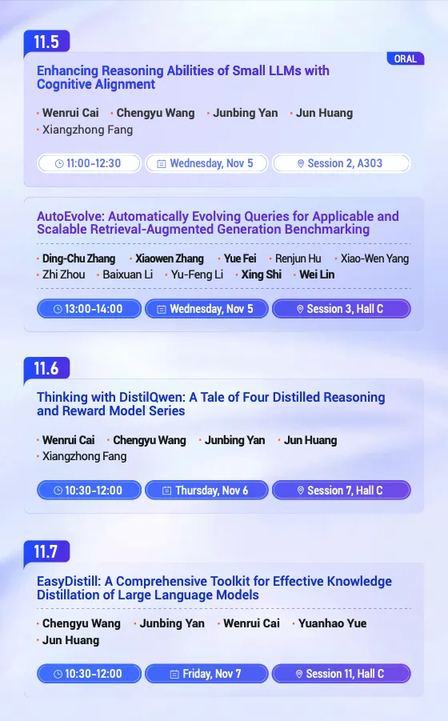 阿里云人工智能平台 PAI 共有 4 篇论文中选 EMNLP 2025,分别为高效知识蒸馏工具包、推理能力提升框架、蒸馏推理与奖励模型及 RAG 自动化评测。