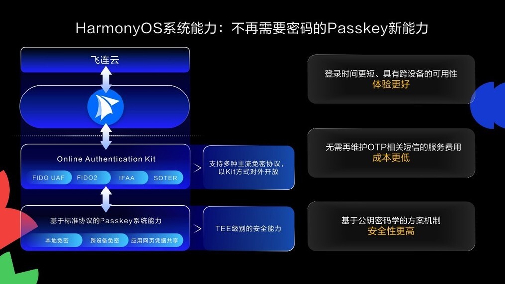 作为新一代数字化办公的 IT 基础设施,火山引擎飞连具备多平台部署和多端使能的特点,因此构建安全且无缝的免密认证体验尤为关键。基于此,火山引擎飞连与 HarmonyOS 星盾安全 2.0 合作,通过接入 Online Authentication Kit 打造了 Passkey 免密认证解决方案,实现了跨设备、跨应用形态的免密认证体验。该方案相较于传统免密认证,实现了以下三大突破:
