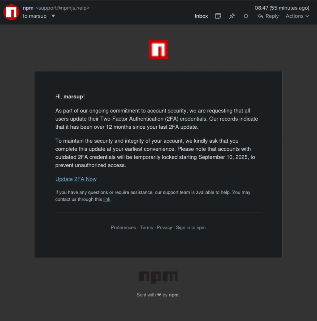 “作为我们持续加强账号安全的一部分,我们要求所有用户更新双因素认证(2FA)凭证。我们的记录显示,您已超过 12 个月未更新 2FA。” “为了保证您账号的安全性与完整性,请尽快完成更新。请注意,从 2025 年 9 月 10 日起,未更新的账号将被暂时锁定,以防止未经授权的访问。”
