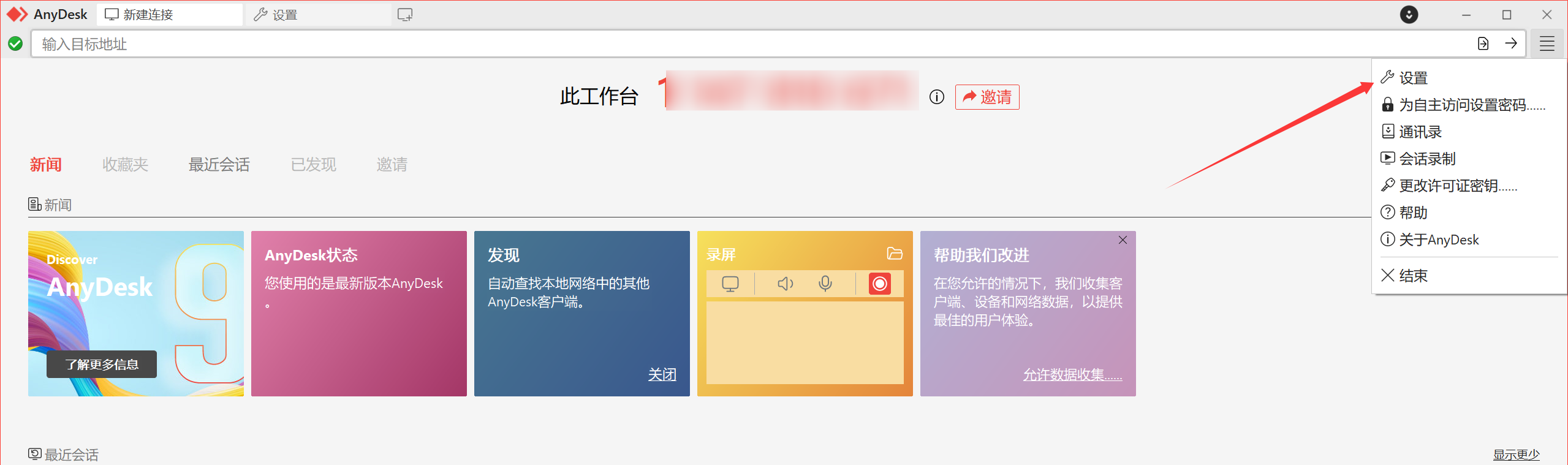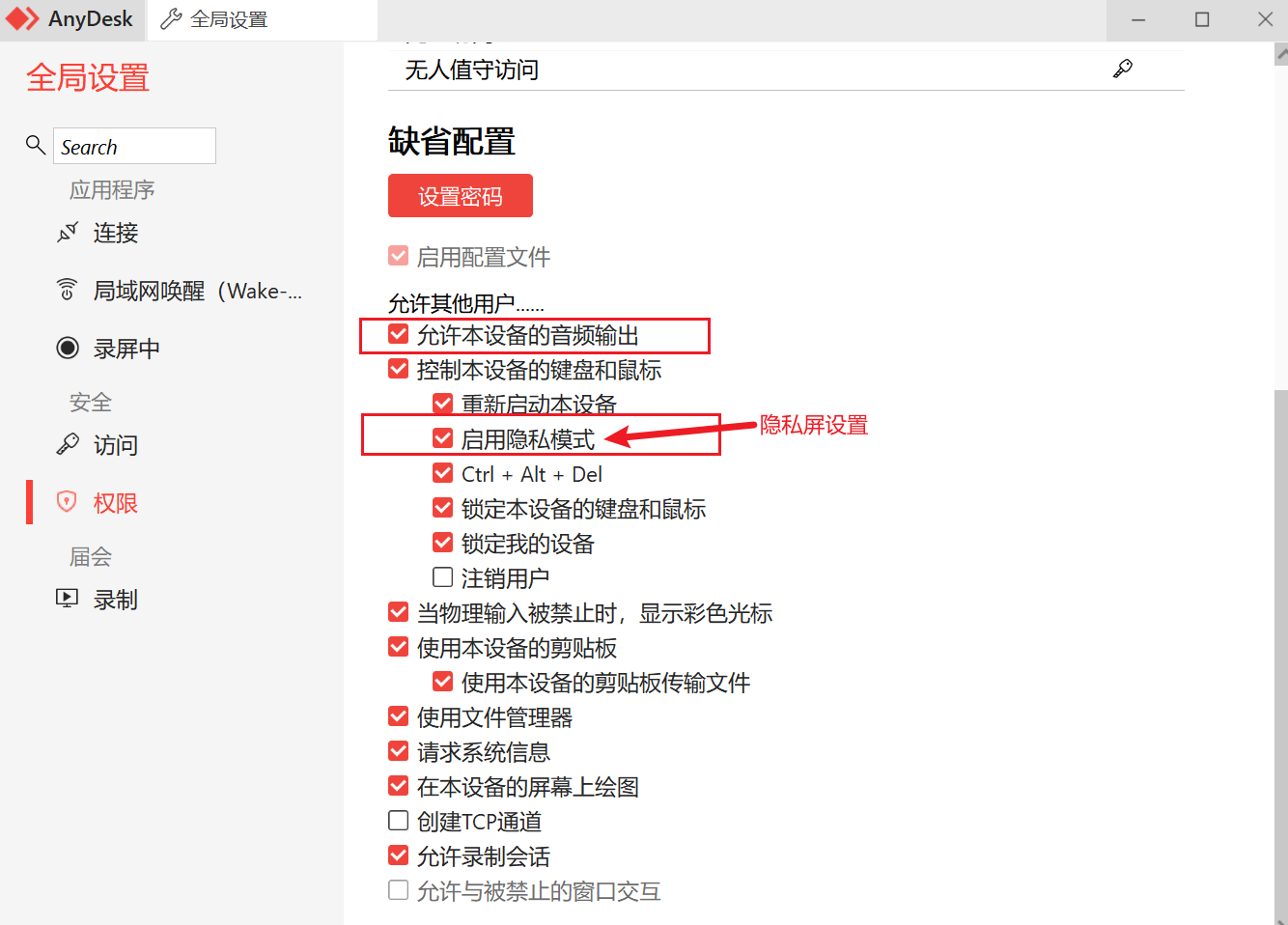 【“隐私屏”功能】首先要在被控端启用隐私模式,在 AnyDesk 首页找设置->权限->缺省配置->打开“控制本设备的键盘和鼠标”->打开“启用隐私模式”完成设置