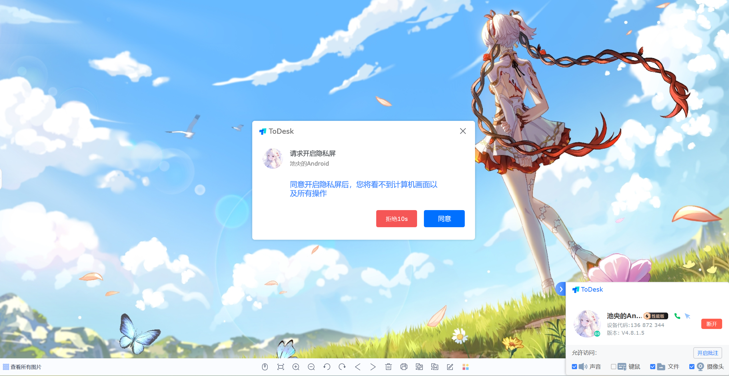 【声音和画面隐私前置】Todesk 的隐私防护的一大亮点是把被控本地声音和隐私屏界面前置,被控本地声音前置可以即时点击打开或关闭被控端的声音;还有之前隐私屏都藏在三级菜单,现在直接在悬浮球就能看到(PC 端),控制端点击就能快速发起开启隐私屏请求,被控端点击“同意”即可开启隐私屏。这种“请求-同意”的交互模式,既尊重了被控端的用户,又让发起隐私保护的操作变得行云流水,让我感觉安全感触手可及。