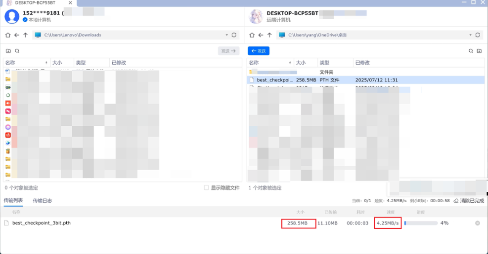 直接文件互传实测,传输速度可达 4.25MB/s,进度条清晰展示文件大小与实时速度,大文件传输高效流畅。