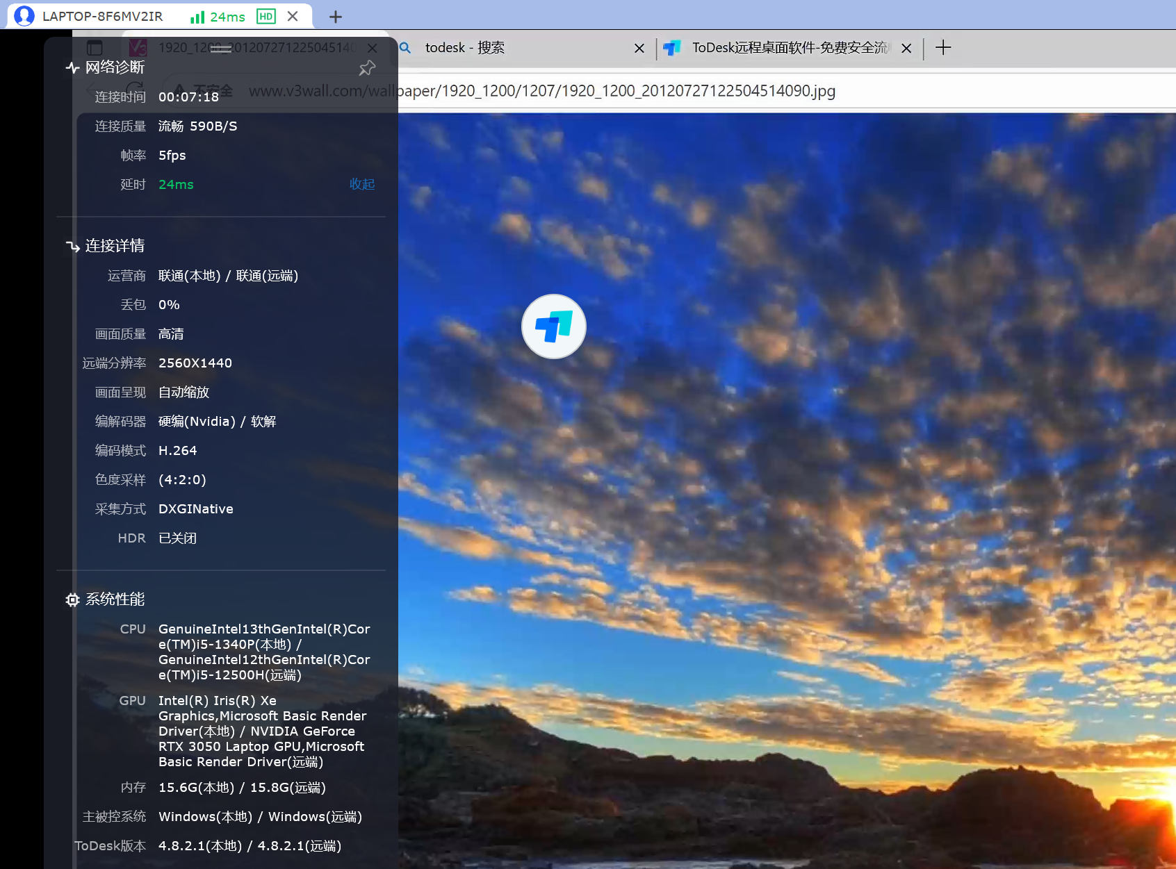 信息完整性:不仅展示核心的实时帧率、网络延时,还提供编解码器、色度采样方法等技术细节;更延伸至系统性能维度,清晰呈现被控端 CPU、GPU 配置及内存使用情况,帮助用户快速定位 “卡顿是网络问题还是设备性能问题”,信息专业且实用。