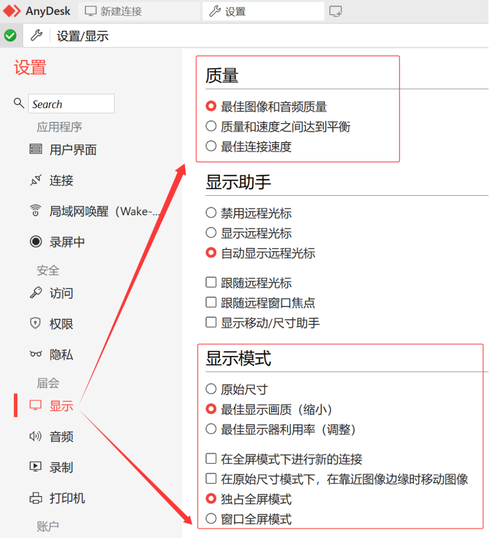 【连接质量设置】AnyDesk 给出了三种模式分别是 最佳图像和音频质量,质量和速度之间达到平衡,最佳连接速度。分别对于高、中、低三种画质,其他的画面设置都没有在细分,划分很粗糙简单。