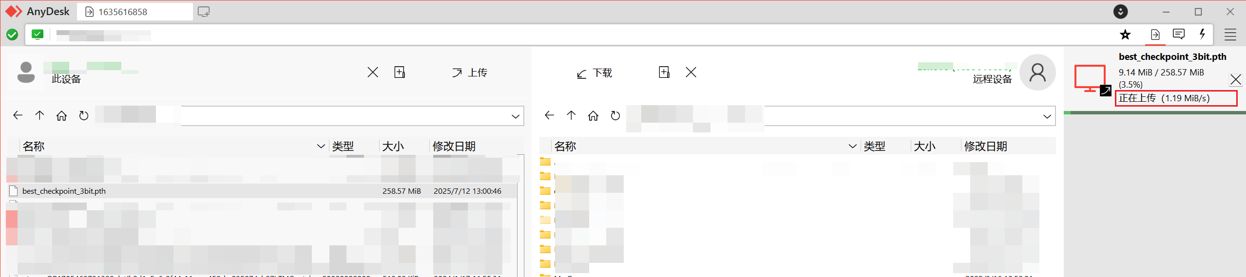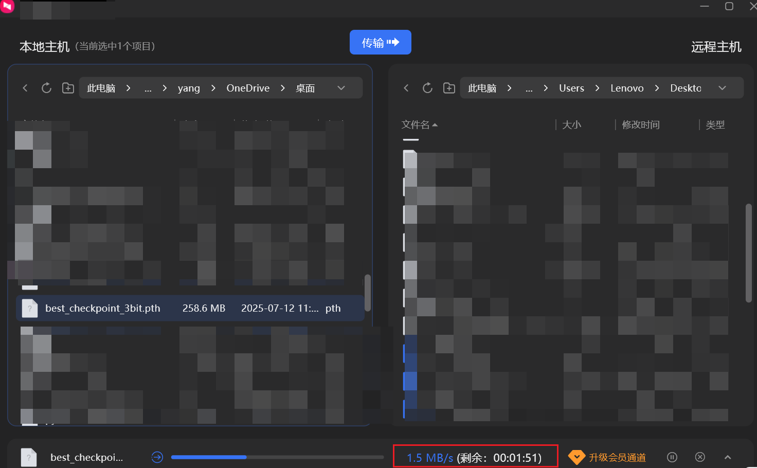 向日葵缺乏专门的文件传输实时消息提醒,选择传输的文件,可以看到传输速度为 1.5MB/s,速度慢于 ToDesk,且界面提示 “升级会员” 可优化传输,免费版体验有局限。