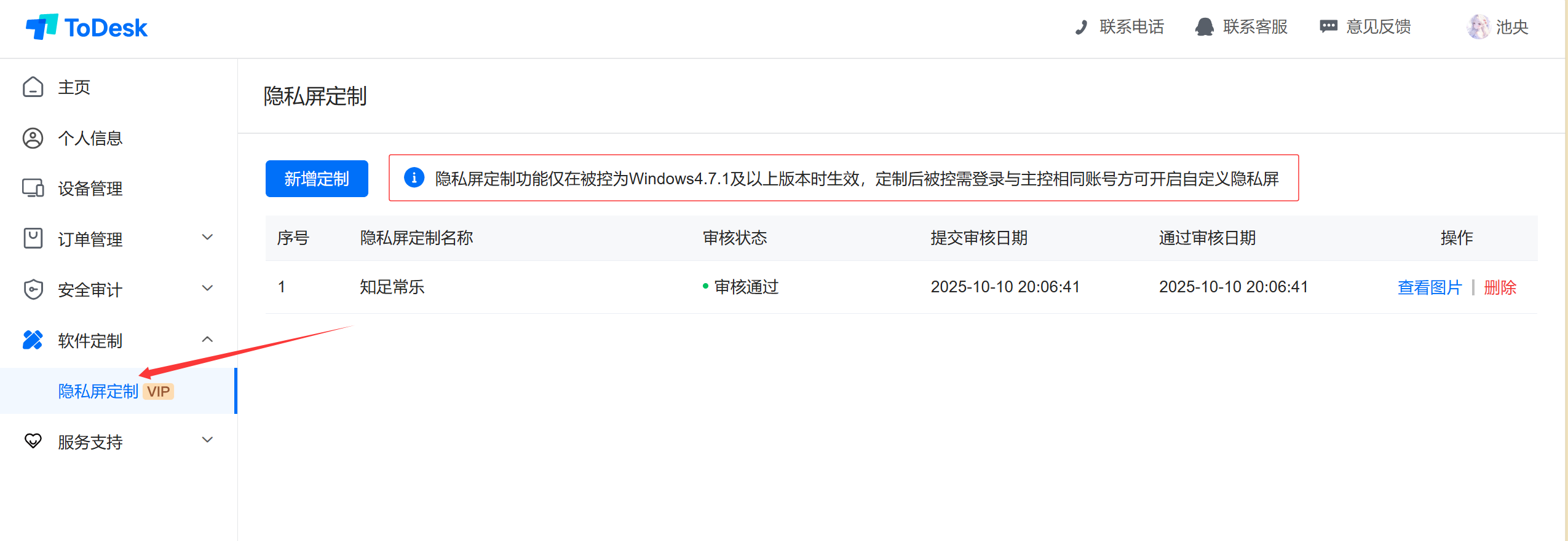 隐私屏定制:这是 VIP 专属的个性化功能,用户可以自定义隐私屏的显示内容。但请注意,该功能的使用有明确的限制:它要求主控端与被控端必须登录在同一个账号下,并且被控的设备必须是 Windows 电脑,且隐私屏定制功能仅在被控为 Windows4.7.1 及以上版本时生效,定制后被控需登录与主控相同账号方可开启自定义隐私屏。