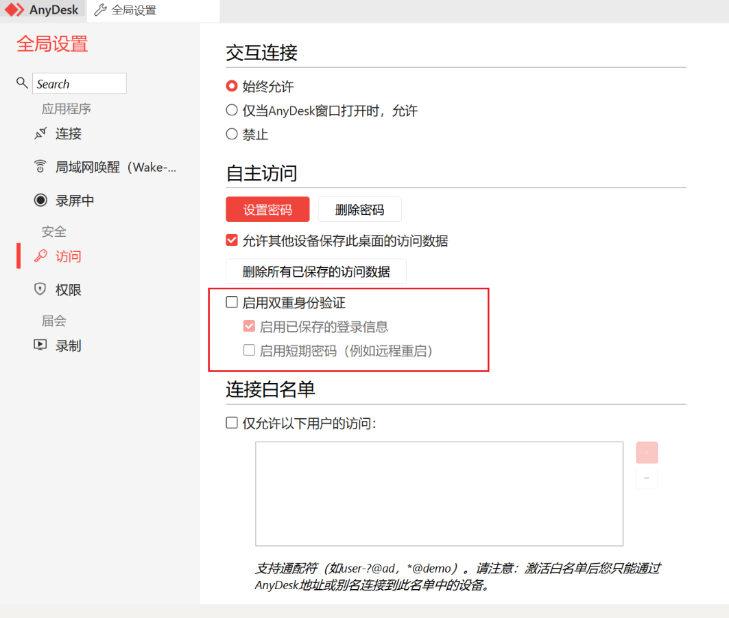 分层安全保障:第一重保障:远程协助模式本身可以设置为关闭状态,从源头上阻断连接请求。第二重保障:启用“双重验证访问”,在控制端进行额外验证,增加了冒充控制端的难度。
