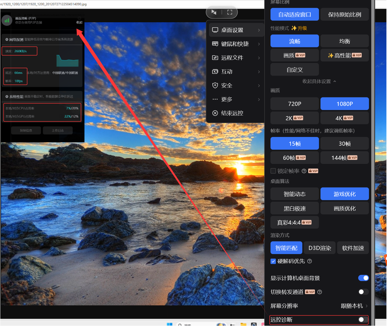 【网络状况】在菜单中找到桌面设置->打开远控诊断,就能显示网络诊断。操作路径较深,不如 ToDesk 便捷。